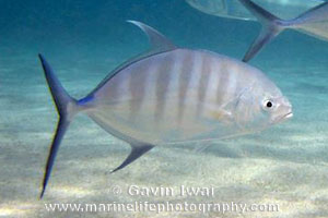 Uncommon on sandy reefs in small groups. Oval body with faint dark bars. Attains 21 inches. Excellent food fish. Red Sea to Polynesia.