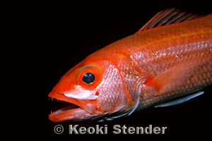 the upper jaw and two below, forked tail lacks elongate tips. A voracious predator of small fish & crustaceans.