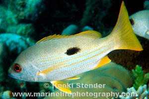 Occurs along reefs and dropoffs. Ragged dark spot and all fins yellow, occasionally yellow stripes on belly. Attains 22 inches. Red Sea to Okinawa, and French Polynesia.