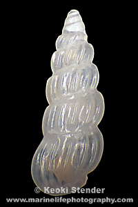 or rubble at any depth. Turreted, glassy white whorls with strong axial ribs