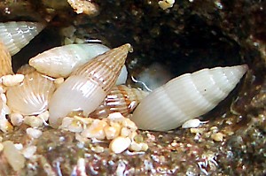 or rubble in shallow water. Solid, glossy, whorls nearly flat with