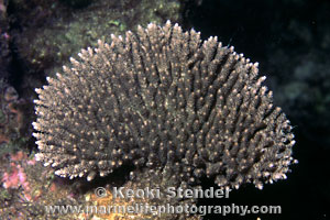 murky water. Domed plates with short thin upturned branches, radial corallites