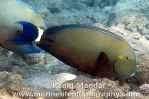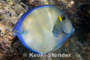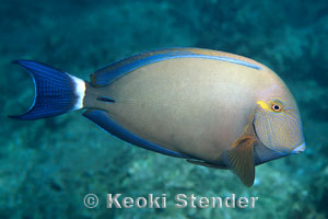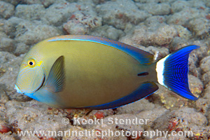 Common on sandy reefs where it feeds upon algal film growing on sand. Olive or dark brown with brown pectoral fins, a white band on the caudal peduncle, and a long black caudal spine.