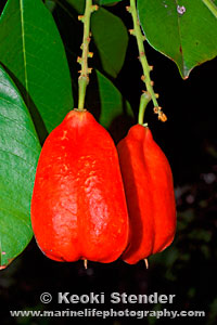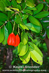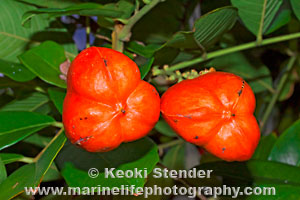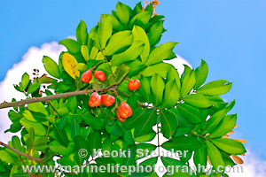 Ornamental tree native to Tropical West Africa. Ripened white aril is