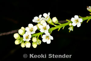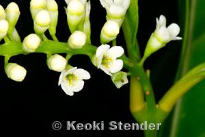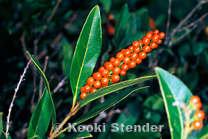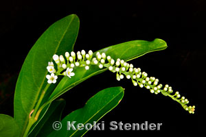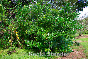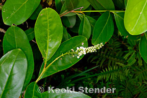 | Invasive shrub or tree from Tropical America. Thick leaves with blunt tips, white flowers borne on spikes, fruits purplish-black when ripe. Readily dispersed by birds. Common in the southern Ko'olau mountains of Oahu. |