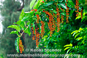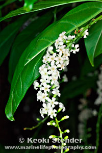 | Invasive shrub or tree with fragrant flowers and papery deciduous leaves turning orange during spring or summer. Common at the base of Ko'olau cliffs in Waimanalo, Oahu. Native from Florida to Venezuela. |