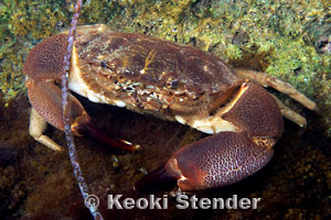 | Common in muddy areas near shore. Purplish brown carapace and claws,