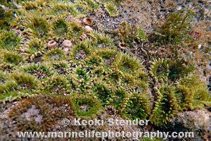 | Locally common near shore among mixed rock and sand exposed to surge. Adults green, young gray or tan with white