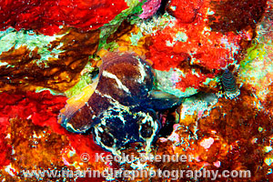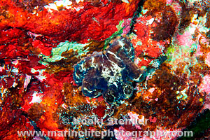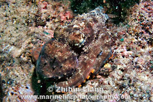 | Common at night on rocky reefs at any depth. Color pattern variable with two white