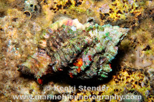 Common under stones on rocky reefs where it drills into other mollusks, often in clusters. Extremely variable in form and color, typically encrusted with coralline algae. Attains 5 inches. North Carolina to Brazil. Formerly known as Chicoreus pomum.