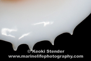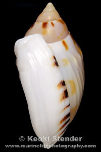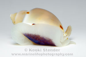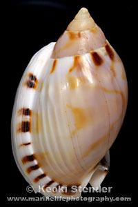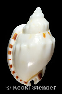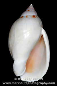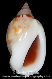 thick, four sharp denticles along bottom of outer lip, aperture wine. Attains 2.5 inches.