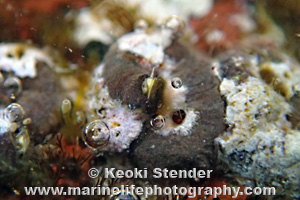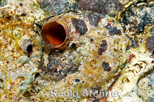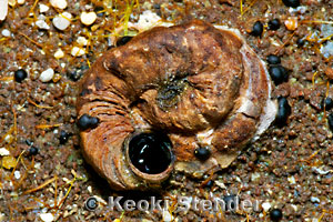 often coated by coralline algae, aperture dark brown. Aperture diameter