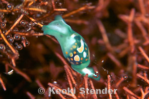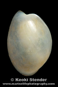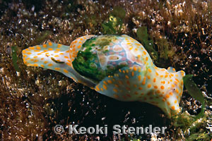 Shell transparent, animal translucent green with orange spots. Animal