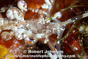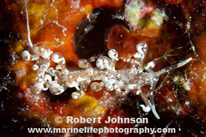curved cerata, white speckles, and brown gut content visible. Attains 1 inch.
