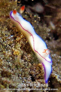 White body with purple rim, gills & rhinophores reddish-orange, no marginal glands; Thorunna kahuna has a pink body with white marginal glands